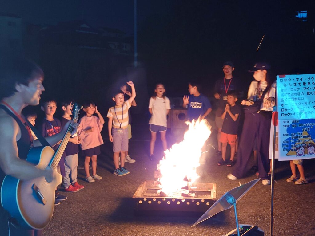夜のキャンプファイヤーでは、歌・ダンス・ゲームで盛り上がり、スタッフ“ひらっち”による鉄拳風フリップ芸「こんなサンスポは嫌だ!」で大爆笑!そこからは子どもたちが次々とネタを披露する大喜利タイムへ突入。気づけばステージがネタを披露する子どもたちで埋まるほどの大盛り上がりとなりました。