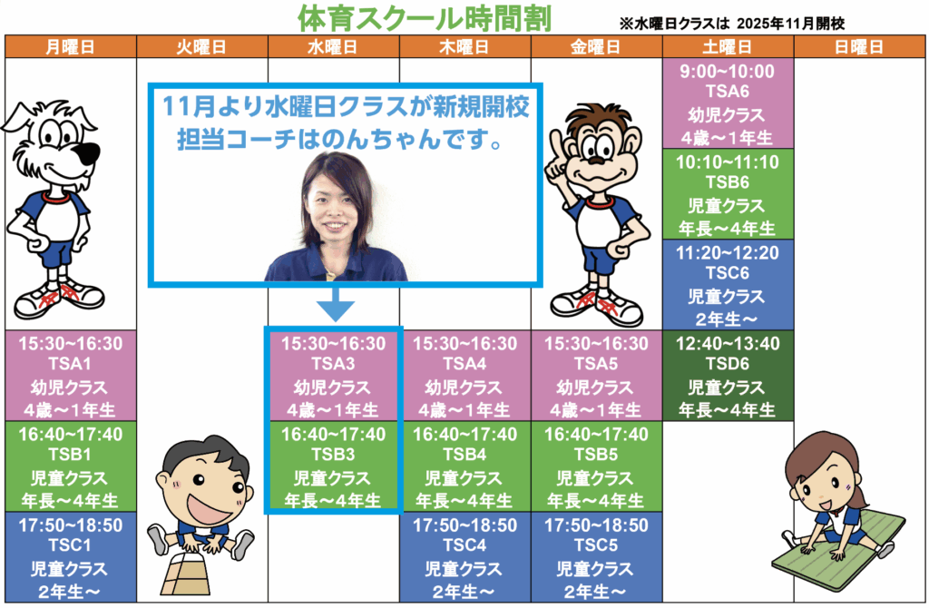 11月から、体育スクールに水曜日クラスが新たに開校します。