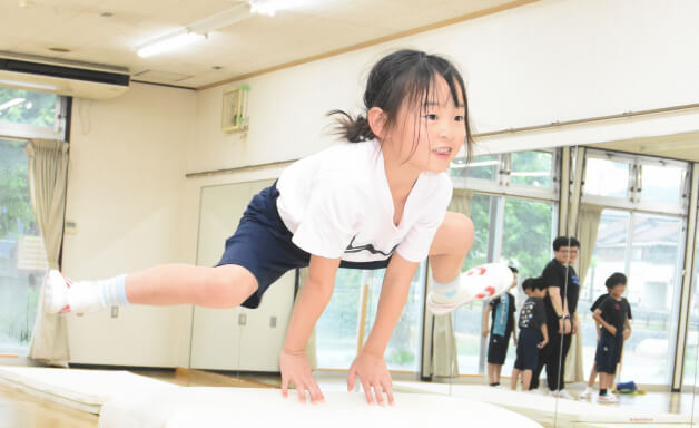 マット、跳箱、鉄棒などの体育器具を使って、低年齢から楽しく運動する習慣を身につけます。運動能力・体力の向上だけでなく、脳神経系の発育にも重要な役割を果たします。